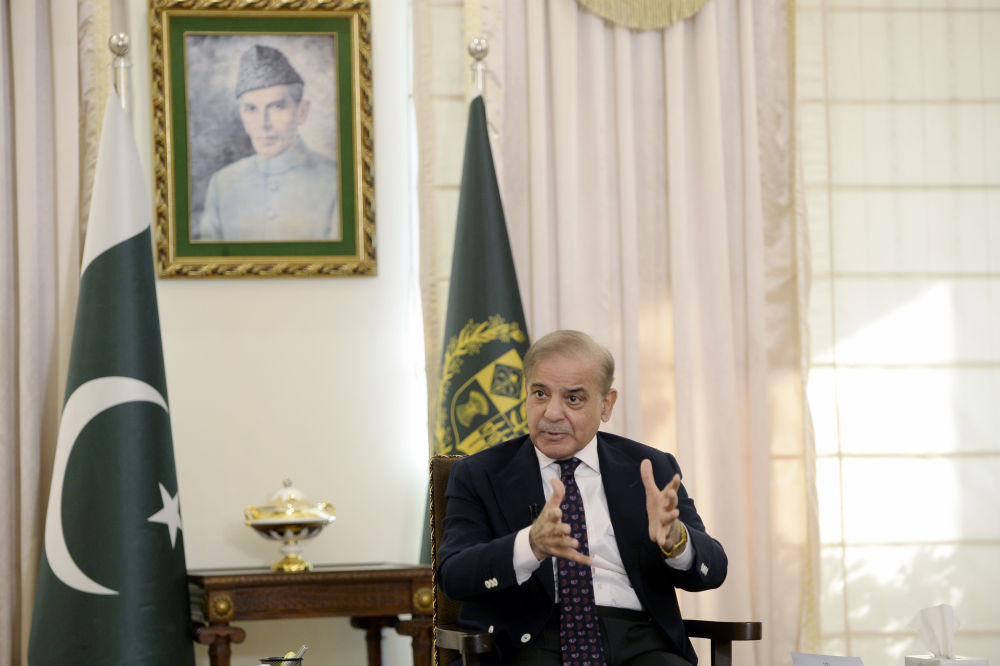 5月30日,巴基斯坦總理夏巴茲·謝里夫在首都伊斯蘭堡的總理府接受中國媒體聯合采訪。新華社發(fā)(艾哈邁德·卡邁勒攝)