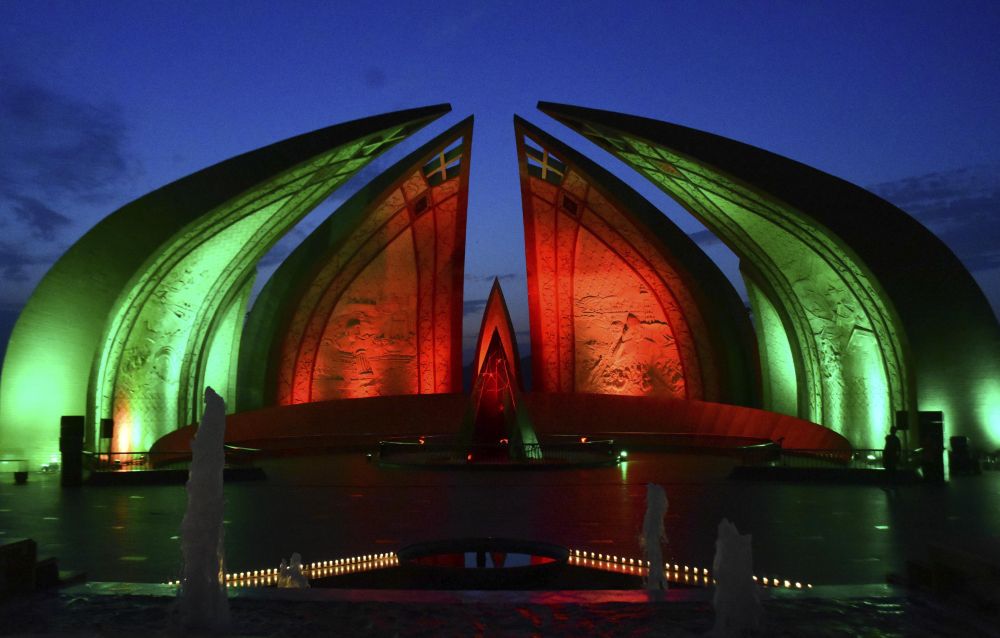 2023年7月29日,巴基斯坦首都伊斯蘭堡的巴基斯坦紀念碑亮起中巴兩國國旗顏色的燈光,慶祝中巴經濟走廊啟動十周年。新華社發(fā)