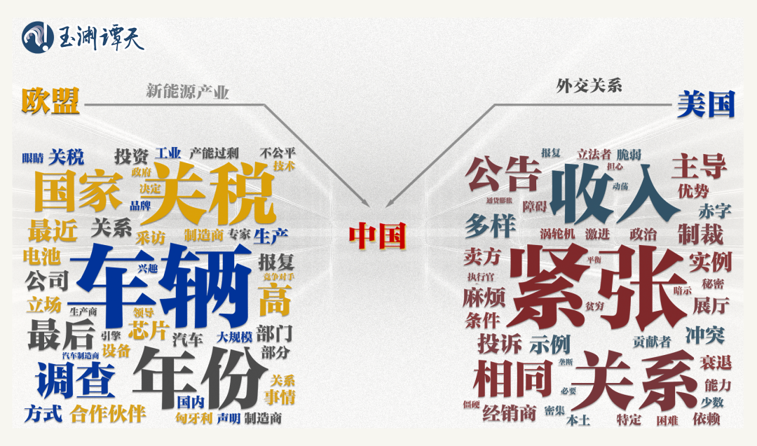 可以看到,以“車輛”“部門”“公司”“制造”等詞為代表的關(guān)鍵詞,都指向了新能源行業(yè)。相比之下,美國媒體對同一話題的討論,更側(cè)重“緊張”“關(guān)系”“沖突”“政治”等指向外交關(guān)系的關(guān)鍵詞。