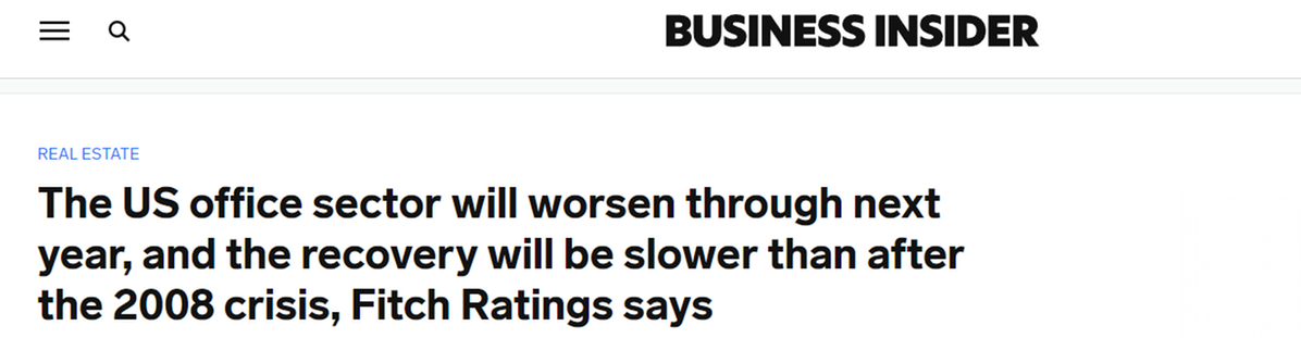 惠譽(yù)稱:“與2008年全球金融危機(jī)之后相比,此輪周期中寫字樓行業(yè)的復(fù)蘇將更加緩慢、耗時(shí),并將導(dǎo)致美國房地產(chǎn)價(jià)值永久性受損、業(yè)績(jī)表現(xiàn)疲軟以及貸款損失增加?!?/p>