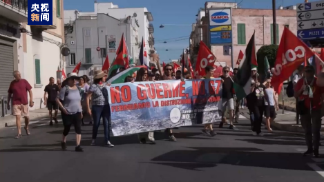 示威者在七國(guó)集團(tuán)峰會(huì)舉辦地法薩諾市舉著反對(duì)戰(zhàn)爭(zhēng)的標(biāo)語(yǔ)