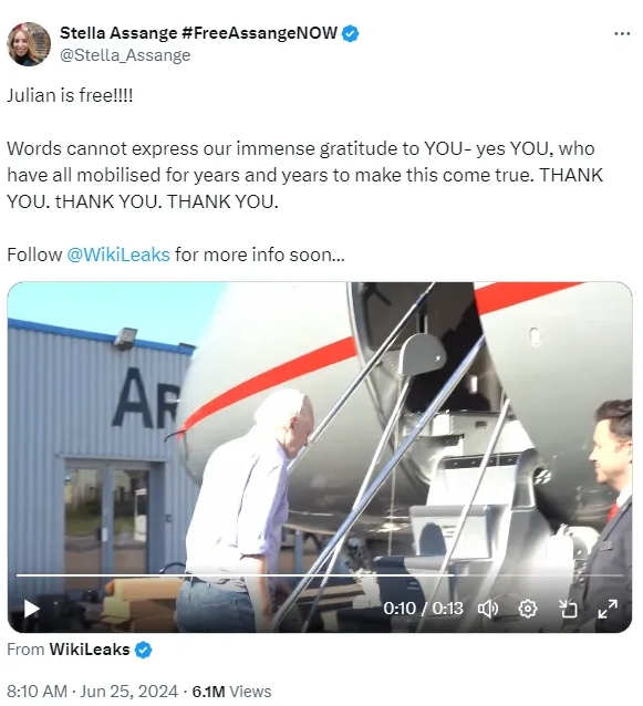 當?shù)貢r間25日,朱利安·阿桑奇的妻子斯特拉在社交媒體上激動地寫道,“言語無法表達我們對你們的感激之情——是的,就是你們,多年來,你們一直努力讓這一切成為現(xiàn)實。謝謝你們。謝謝你們,謝謝你們?!?/p>