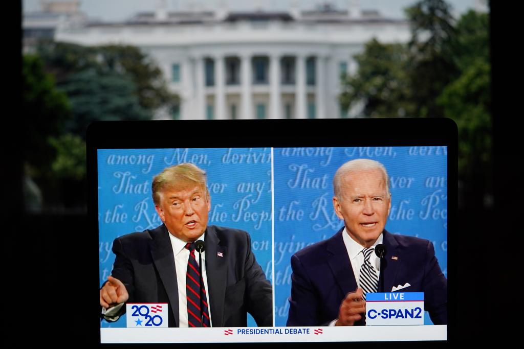 這張2020年9月29日在美國(guó)弗吉尼亞州阿靈頓拍攝的視頻畫(huà)面顯示,時(shí)任美國(guó)總統(tǒng)特朗普(左)與時(shí)任美國(guó)民主黨總統(tǒng)候選人拜登在俄亥俄州克利夫蘭市參加2020年美國(guó)總統(tǒng)候選人首場(chǎng)電視辯論。新華社記者 劉杰 攝