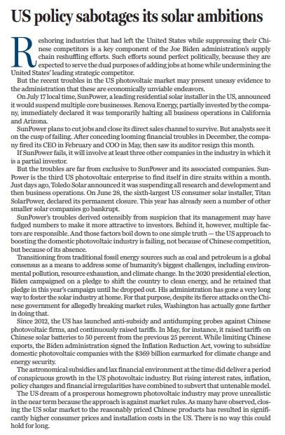 自2012年起,美國就開始對中國光伏企業(yè)發(fā)起反補貼和反傾銷調(diào)查,并不斷提高關(guān)稅。例如,今年5月,美國白宮宣布,對中國產(chǎn)太陽能電池征收的關(guān)稅將從原先的25%上調(diào)至50%。在限制中國對美出口的同時,拜登政府簽署的《通脹削減法案》還撥款3690億美元應(yīng)對氣候變化、維護能源安全,承諾將借此對國內(nèi)光伏企業(yè)實施補貼。