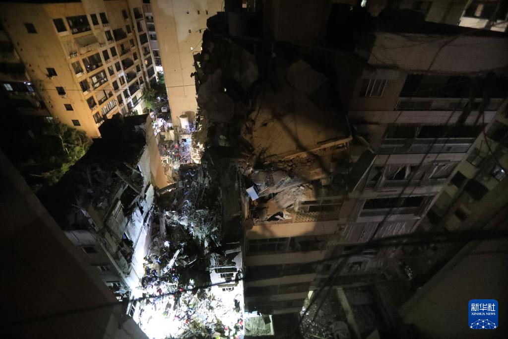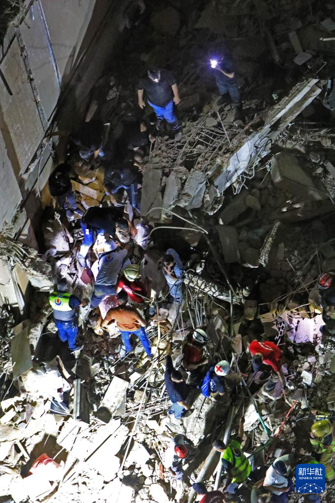 7月30日,在黎巴嫩貝魯特南郊,救援人員在以軍襲擊毀壞的建筑廢墟上搜尋幸存者。新華社發(fā)(比拉爾·賈維希攝)