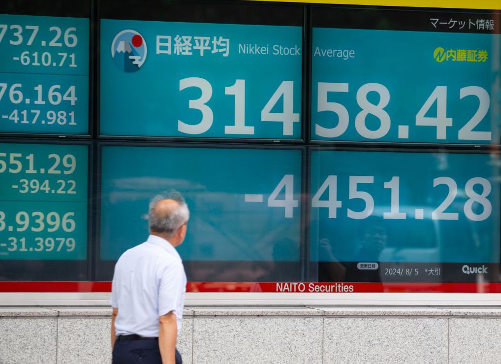 8月5日,行人走過位于日本東京的顯示實(shí)時股價的電子屏幕。新華社記者岳晨星攝