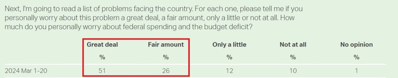 美國(guó)民意調(diào)查機(jī)構(gòu)蓋洛普公司今年進(jìn)行的一份關(guān)于美國(guó)聯(lián)邦債務(wù)的調(diào)查結(jié)果顯示,對(duì)聯(lián)邦債務(wù)問(wèn)題感到“非常擔(dān)心”和“嚴(yán)重?fù)?dān)心”的受訪者達(dá)到77%。