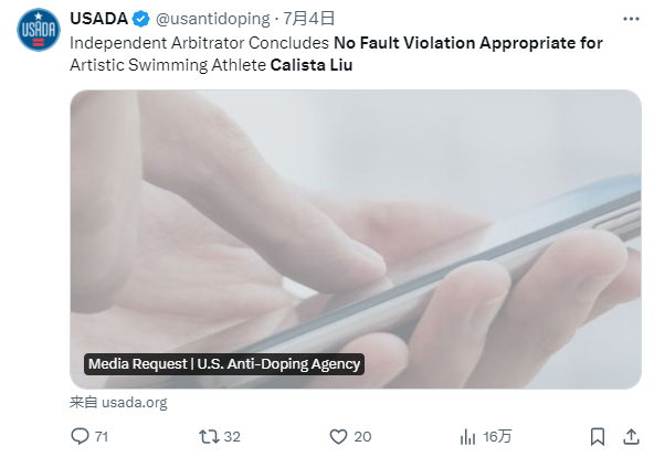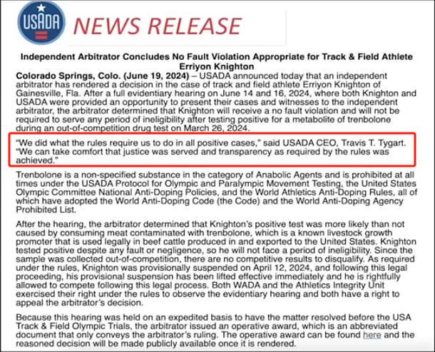 這屆奧運會,享受了美國這項“服務(wù)”的除了花游運動員卡莉斯塔,還有田徑運動員埃里揚·奈頓。他們分別在5月和3月藥檢陽性,但巧的是,美國官方對這兩人的脫罪聲明都是卡在奧運會前發(fā)出,“及時”地保住了他們的參賽資格,然后美國反興奮劑機構(gòu)官網(wǎng)又“及時”地把聲明刪掉了。