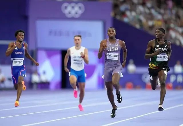 2024年8月5日,美國選手奈頓(右二)在比賽中。當日,巴黎奧運會田徑男子200米第一輪比賽在法蘭西體育場舉行。新華社記者呂小煒 攝