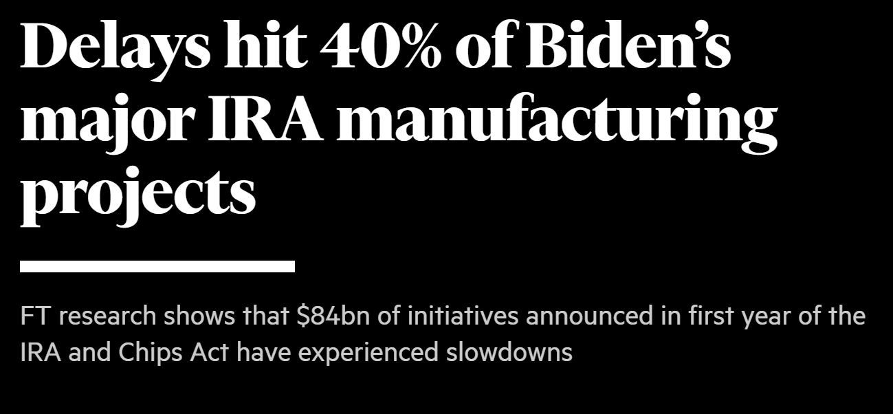 然而,《金融時(shí)報(bào)》的調(diào)查發(fā)現(xiàn),與上述法案相關(guān)的過(guò)億美元大項(xiàng)目共114個(gè),總投資2279億美元,但其中總投資約840億美元的項(xiàng)目進(jìn)度滯后兩個(gè)月至數(shù)年,甚至無(wú)限停擺。
