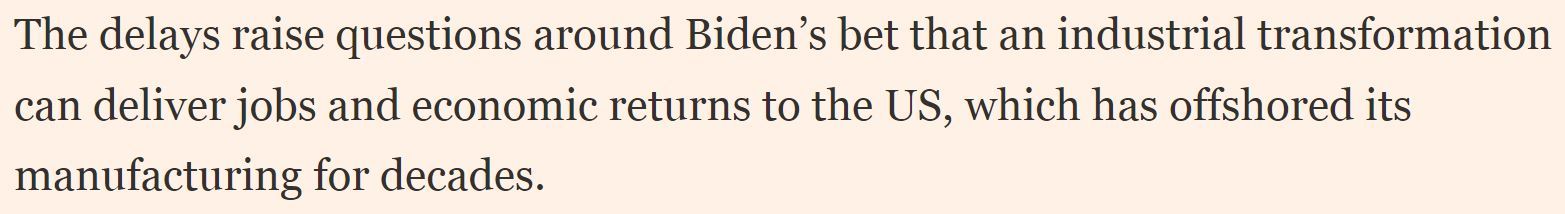 按照《金融時(shí)報(bào)》的說(shuō)法,項(xiàng)目遲滯令輿論質(zhì)疑拜登政府所篤定的工業(yè)轉(zhuǎn)型有望為美國(guó)帶來(lái)就業(yè)和經(jīng)濟(jì)回報(bào)的說(shuō)法。