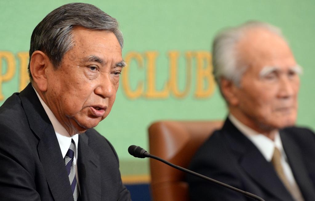 2015年6月9日,在日本東京,日本前內(nèi)閣官房長官河野洋平(左)發(fā)表講話。當日,河野洋平和前首相村山富市在日本記者俱樂部舉行對談,重申承認殖民侵略歷史事實、堅持和平憲法對日本的重要意義。新華社記者馬平攝