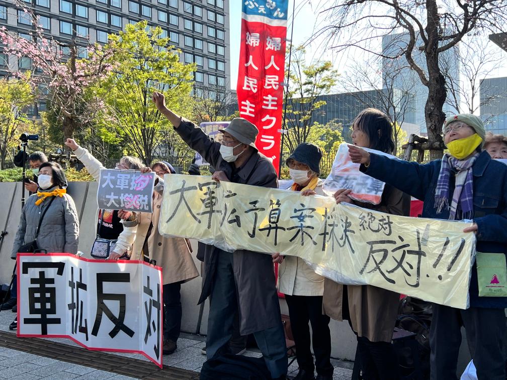 2023年3月28日,在日本東京,民眾在參議院議員會館前舉行抗議活動,反對參議院當天通過“軍備擴張預算”案。新華社記者姜俏梅攝