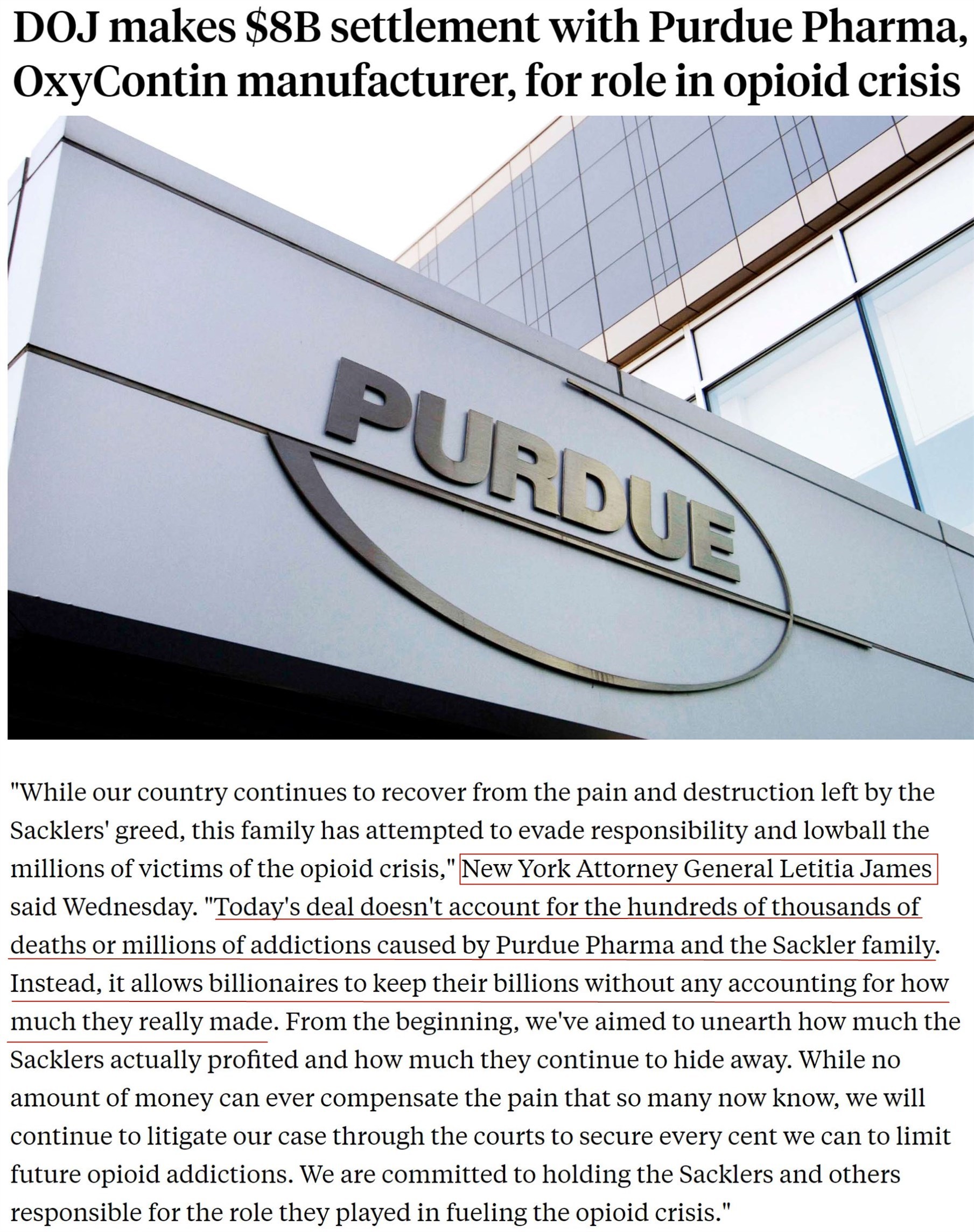 但紐約州總檢察長利蒂希婭·詹姆斯發(fā)表聲明,批評司法部與普渡制藥公司達(dá)成的和解協(xié)議,表示“協(xié)議不能解決普渡制藥公司和薩克勒家族造成的數(shù)十萬人死亡以及數(shù)百萬人成癮的現(xiàn)實(shí)。相反,和解協(xié)議使億萬富翁可以保留其數(shù)十億美元的資產(chǎn)而無需為他們實(shí)際造成的傷害付出代價(jià)?!?/p>