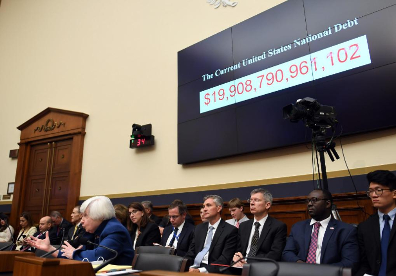 2017年7月12日,時任美國聯(lián)邦儲備委員會主席耶倫(前)在華盛頓出席國會聽證會,屏幕顯示美國當(dāng)時的國債近20萬億美元。新華社記者殷博古攝
