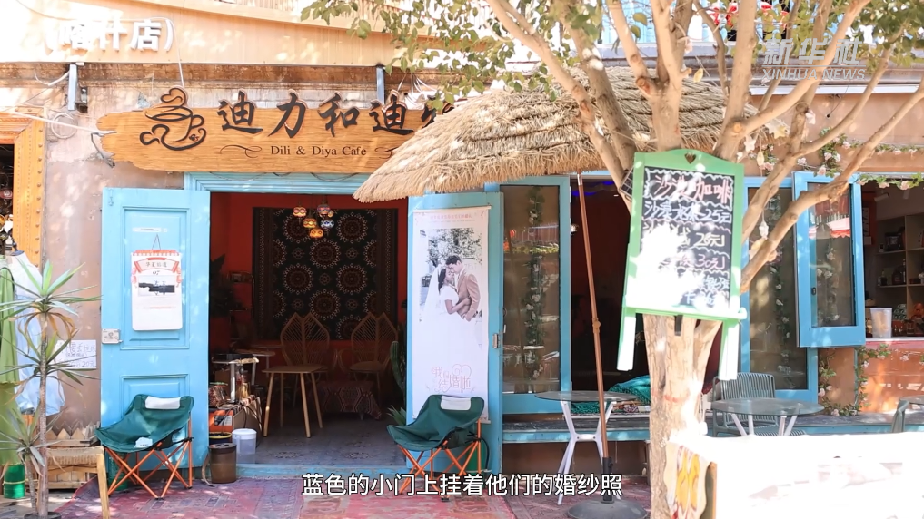 咖啡館木制的門頭雕刻著夫妻倆的名字,藍色的小門上掛著他們的婚紗照,照片里的海迪雅來自非洲東部坦桑尼亞桑給巴爾島,迪力夏提是新疆喀什本地人。