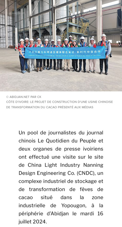 7月16日,人民日?qǐng)?bào)與兩家科特迪瓦新聞機(jī)構(gòu)記者一行參觀了由中國(guó)輕工業(yè)南寧設(shè)計(jì)工程有限公司總承包的可可加工及可可豆倉(cāng)庫(kù)建設(shè)項(xiàng)目,該項(xiàng)目坐落在阿比讓郊區(qū)的約普貢工業(yè)區(qū)。