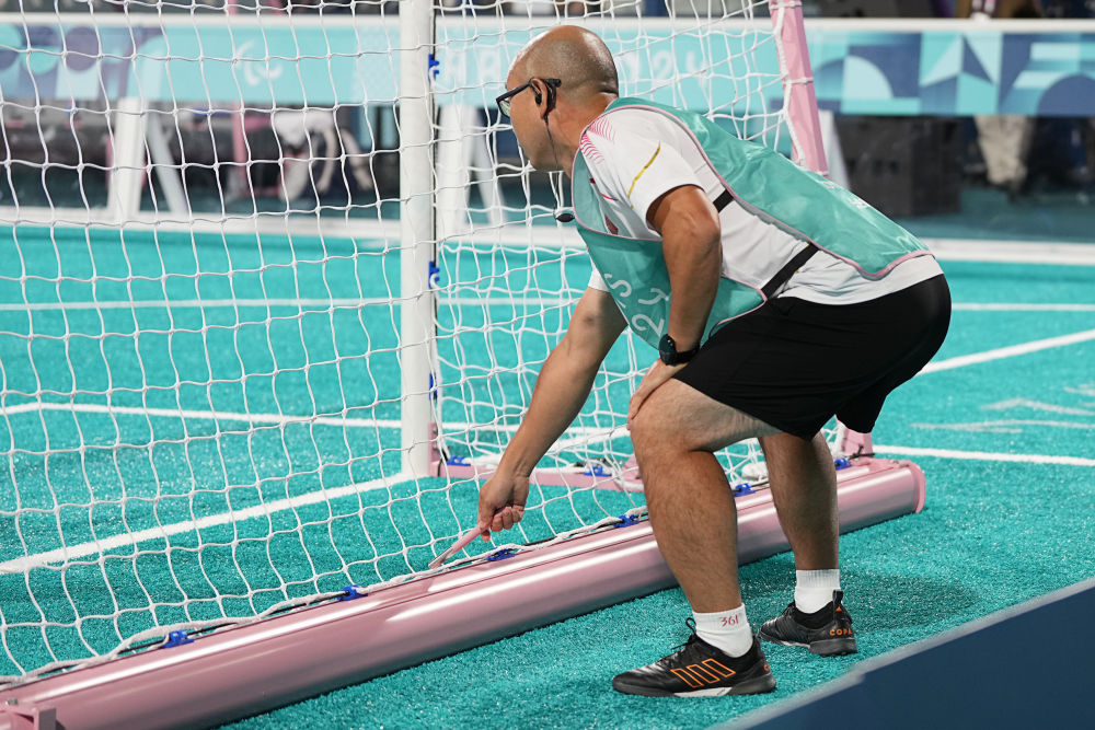 9月1日,中國(guó)隊(duì)引導(dǎo)員李進(jìn)在比賽中用金屬棒敲擊門框幫助球員定位。新華社記者 熊琦 攝
