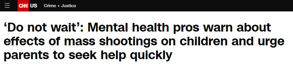 薩爾茲和羅辛-斯萊特都警告表示,(美國社會(huì))急需對(duì)校園槍擊事件或一般槍支暴力事件中幸存的兒童及青少年出現(xiàn)的心理健康問題作出反應(yīng),這對(duì)保護(hù)他們的未來至關(guān)重要。