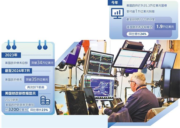 20世紀80年代以來,美債規(guī)模急劇上漲。1990年美國政府債務(wù)總額約為3.2萬億美元,2000年這一數(shù)字增長至約5.62萬億美元,2010年增至約13.56萬億美元,2020年增至約27.74萬億美元,2023年美國政府債務(wù)總額突破34萬億美元。截至2024年7月,美國政府債務(wù)突破35萬億美元,再次創(chuàng)下新高。雖然美聯(lián)儲降息能夠緩解部分償債壓力,但美債規(guī)模擴張勢頭恐怕難以控制,將成為籠罩在全球經(jīng)濟上空的陰影。