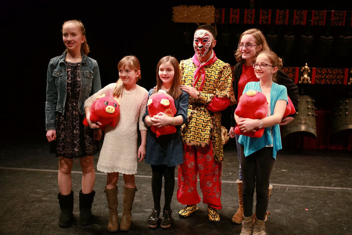2019年2月14日,在美國(guó)馬斯卡廷,當(dāng)?shù)赜^眾在演出結(jié)束后與扮演孫悟空的中國(guó)國(guó)家京劇院演員合影。當(dāng)晚,由湖北省歌劇舞劇院編鐘國(guó)樂(lè)團(tuán)和中國(guó)國(guó)家京劇院一團(tuán)的藝術(shù)家們聯(lián)袂奉獻(xiàn)的“歡樂(lè)春節(jié)”大戲在這里上演。新華社記者 汪平 攝