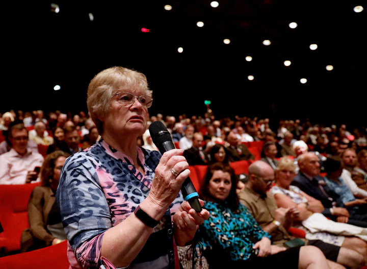 2023年8月15日,在英國(guó)倫敦,“里斯本丸”號(hào)幸存者丹尼斯·莫利之女丹妮絲·維尼在紀(jì)錄片《里斯本丸沉沒(méi)》放映活動(dòng)上與主創(chuàng)人員交流。新華社記者 李穎 攝