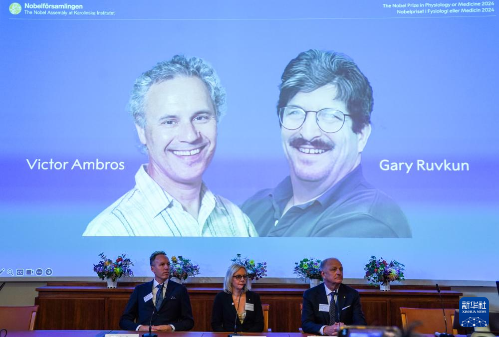10月7日,在瑞典斯德哥爾摩舉行的2024年諾貝爾生理學或醫(yī)學獎公布現(xiàn)場,屏幕顯示獎項得主美國科學家維克托·安布羅斯(左)和加里·魯夫坎的照片。新華社記者 彭子洋 攝
