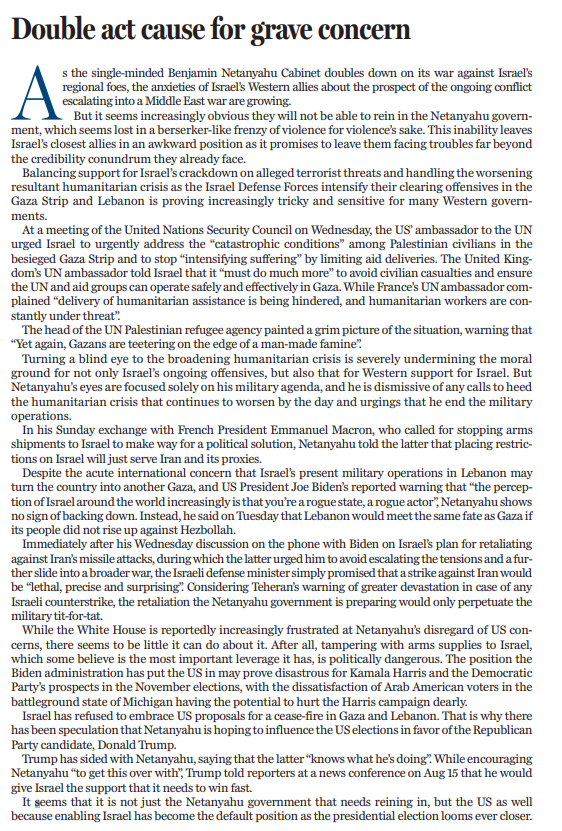 對(duì)不斷擴(kuò)大的人道主義危機(jī)視而不見(jiàn),不僅嚴(yán)重?fù)p害了以色列軍事行動(dòng)的道德基礎(chǔ),也損害了美國(guó)和西方支持以色列的道德基礎(chǔ)。內(nèi)塔尼亞胡眼里只有軍事議程,對(duì)任何要求他關(guān)注人道主義危機(jī)、結(jié)束軍事行動(dòng)的呼聲都置之不理,不屑一顧。