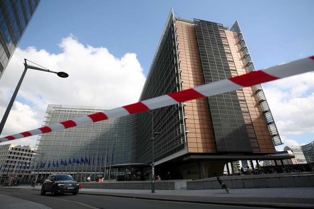 10月4日,在比利時布魯塞爾,車輛駛過歐盟委員會大樓。新華社記者趙丁喆攝