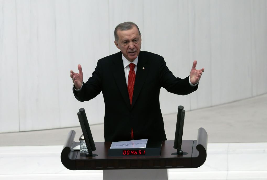 2023年10月1日,在土耳其安卡拉,土耳其總統(tǒng)埃爾多安在議會發(fā)表講話。新華社發(fā)(穆斯塔法·卡亞攝)