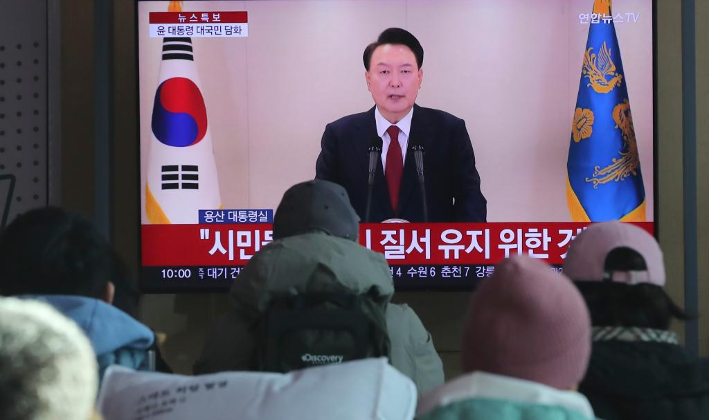 12月12日,在韓國首爾火車站,韓國民眾觀看總統(tǒng)尹錫悅對國民談話的電視直播。新華社記者 姚琪琳 攝