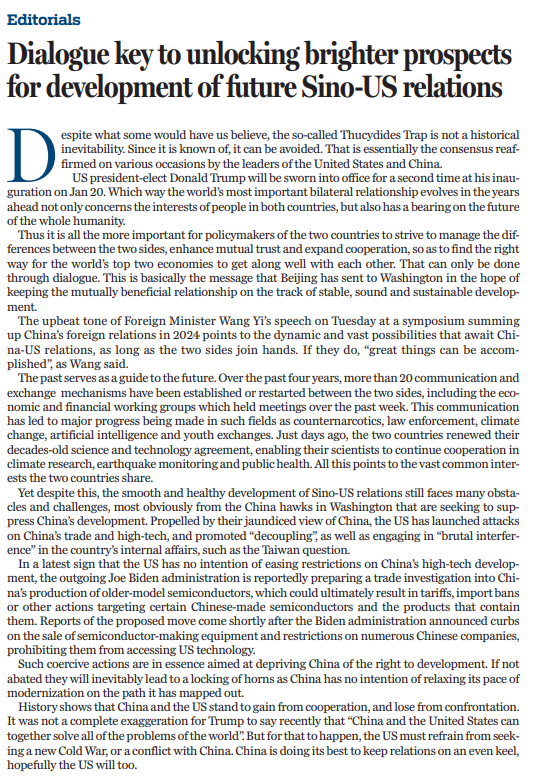 因此,雙方應(yīng)當(dāng)努力管控分歧、增信釋疑、拓展合作,為世界前兩大經(jīng)濟(jì)體開辟友好相處、共同發(fā)展的道路。這只能通過對話溝通來實(shí)現(xiàn)。