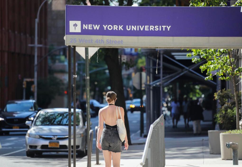 2020年7月14日,一名女子從美國紐約大學(xué)的教學(xué)樓前走過。新華社記者王迎攝