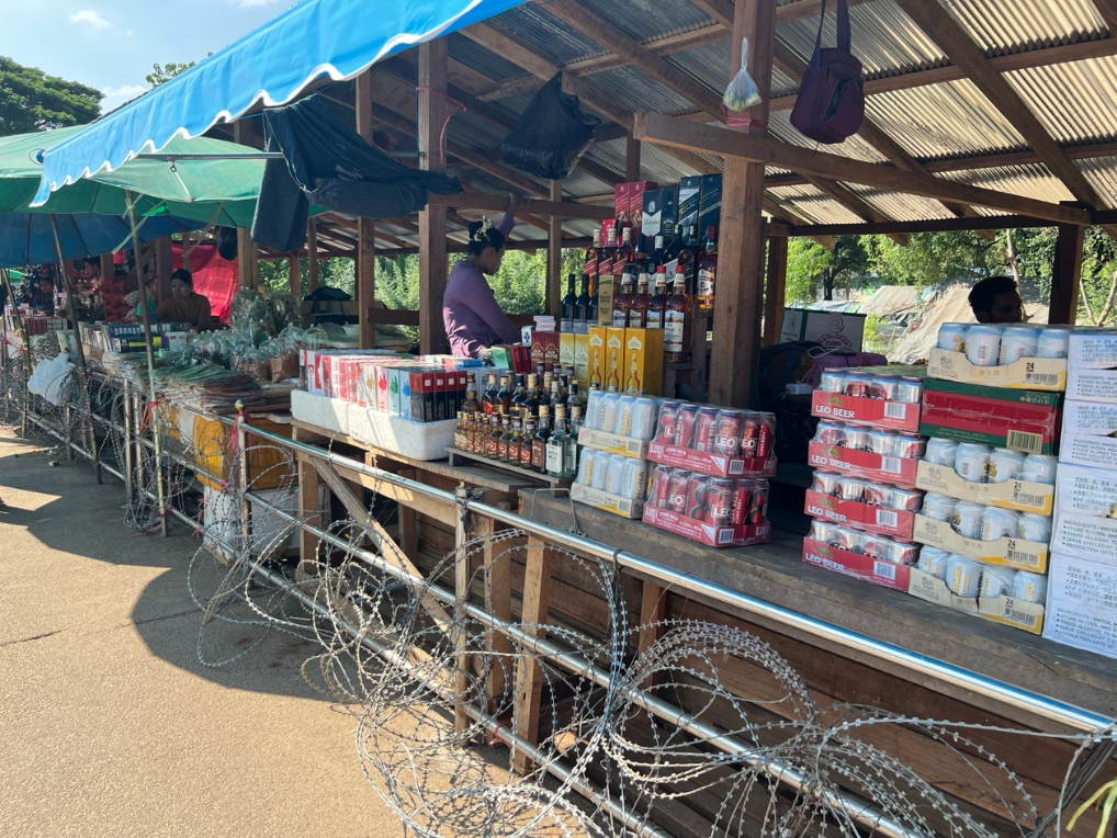 2023年11月27日,在泰國(guó)湄索,緬甸商戶隔著鐵絲網(wǎng)售賣(mài)商品。(新華社記者林昊攝)