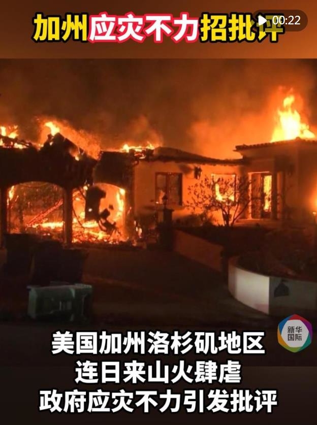 美國加利福尼亞州洛杉磯地區(qū)連日來山火肆虐,截至11日已造成16人死亡,至少13人失蹤,上萬棟房屋被燒毀。州及地方政府應(yīng)災(zāi)不力引發(fā)批評(píng)。