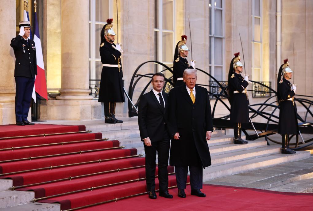 2024年12月7日,法國(guó)總統(tǒng)馬克龍(前左)在巴黎總統(tǒng)府愛麗舍宮歡迎特朗普(前右)。新華社記者 高靜 攝