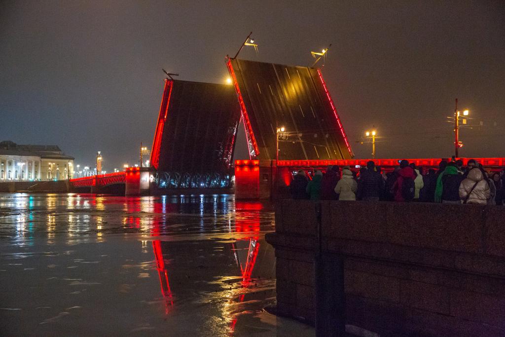 1月29日凌晨,在俄羅斯圣彼得堡,人們?cè)谀吆优嫌^看亮起“中國紅”的冬宮橋開橋。新華社發(fā)(莫京娜攝)