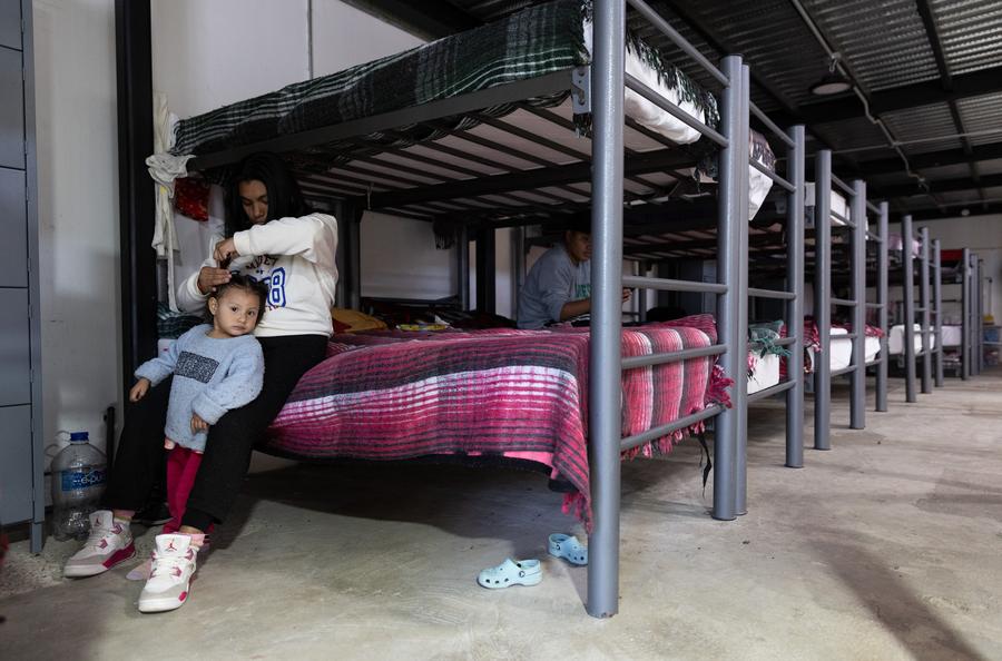 2025年2月2日,在墨西哥奇瓦瓦州華雷斯城的一處移民收容所,一位母親為女兒梳頭。新華社記者李夢(mèng)馨攝