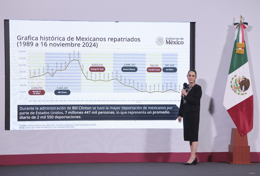 2025年1月21日,墨西哥總統(tǒng)辛鮑姆在首都墨西哥城舉行的例行新聞發(fā)布會(huì)上講話(huà)。新華社發(fā)(墨西哥總統(tǒng)府供圖)