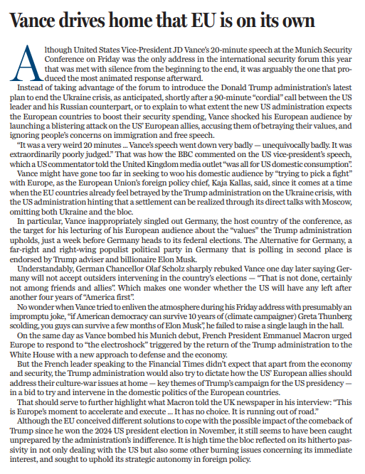 更令人意外的是,萬斯在演講中專門點(diǎn)名批評(píng)了東道主德國(guó),而此時(shí)距離德國(guó)聯(lián)邦選舉僅剩一周。目前,德國(guó)極右翼政黨“德國(guó)選擇黨”在民調(diào)中位列第二,而特朗普的顧問、億萬富翁埃隆·馬斯克正公開支持該黨。不出所料,德國(guó)總理朔爾茨在次日予以嚴(yán)厲回?fù)?,明確表示德國(guó)不會(huì)接受外部勢(shì)力干涉本國(guó)選舉?!懊擞押团笥阎g不會(huì)做這樣的事情?!彼窢柎牡谋響B(tài)不禁引人深思:如果特朗普政府繼續(xù)推行“美國(guó)優(yōu)先”政策,美國(guó)四年后還能剩下多少盟友?