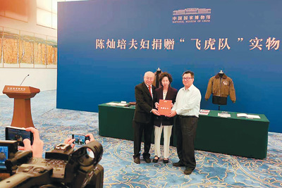 陳燦培夫婦(左一、左二)向中國(guó)國(guó)家博物館捐贈(zèng)飛虎隊(duì)文物?! ∈茉L者供圖