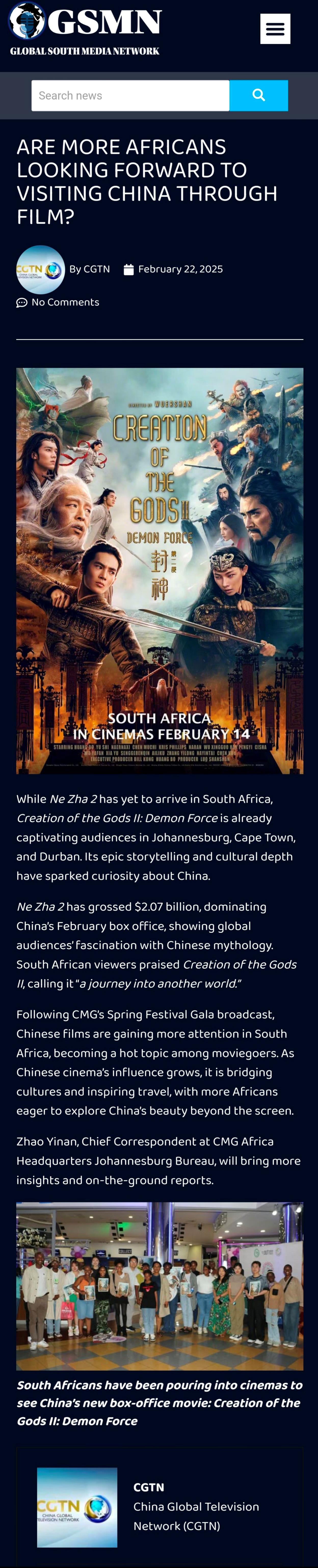總臺(tái)記者在南非約翰內(nèi)斯堡街頭采訪時(shí)發(fā)現(xiàn),隨著《哪吒2》《封神第二部:戰(zhàn)火西岐》《唐探1900》等中國電影的熱映,非洲觀眾對(duì)中國文化和旅游的興趣日益濃厚。許多年輕觀眾認(rèn)為,中國電影的敘事風(fēng)格、視覺特效和文化內(nèi)涵讓他們對(duì)中國歷史、神話以及現(xiàn)代社會(huì)充滿好奇。