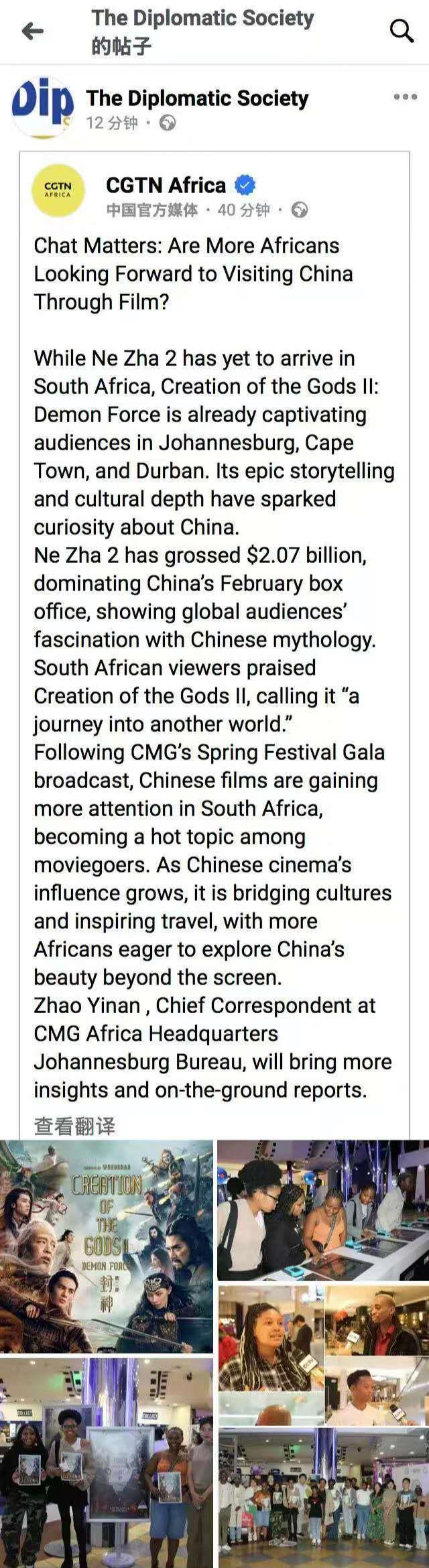 此外,中國春節(jié)檔電影登陸非洲并引發(fā)廣泛影響的相關(guān)報(bào)道被肯尼亞廣播公司、南非獨(dú)立傳媒、南非《外交圈報(bào)》、全球南方新聞網(wǎng)、贊比亞5fm電臺(tái)、津巴布韋廣播公司、岡比亞之聲、剛果新聞網(wǎng)等多家媒體轉(zhuǎn)引轉(zhuǎn)載,觸達(dá)超1億受眾。
