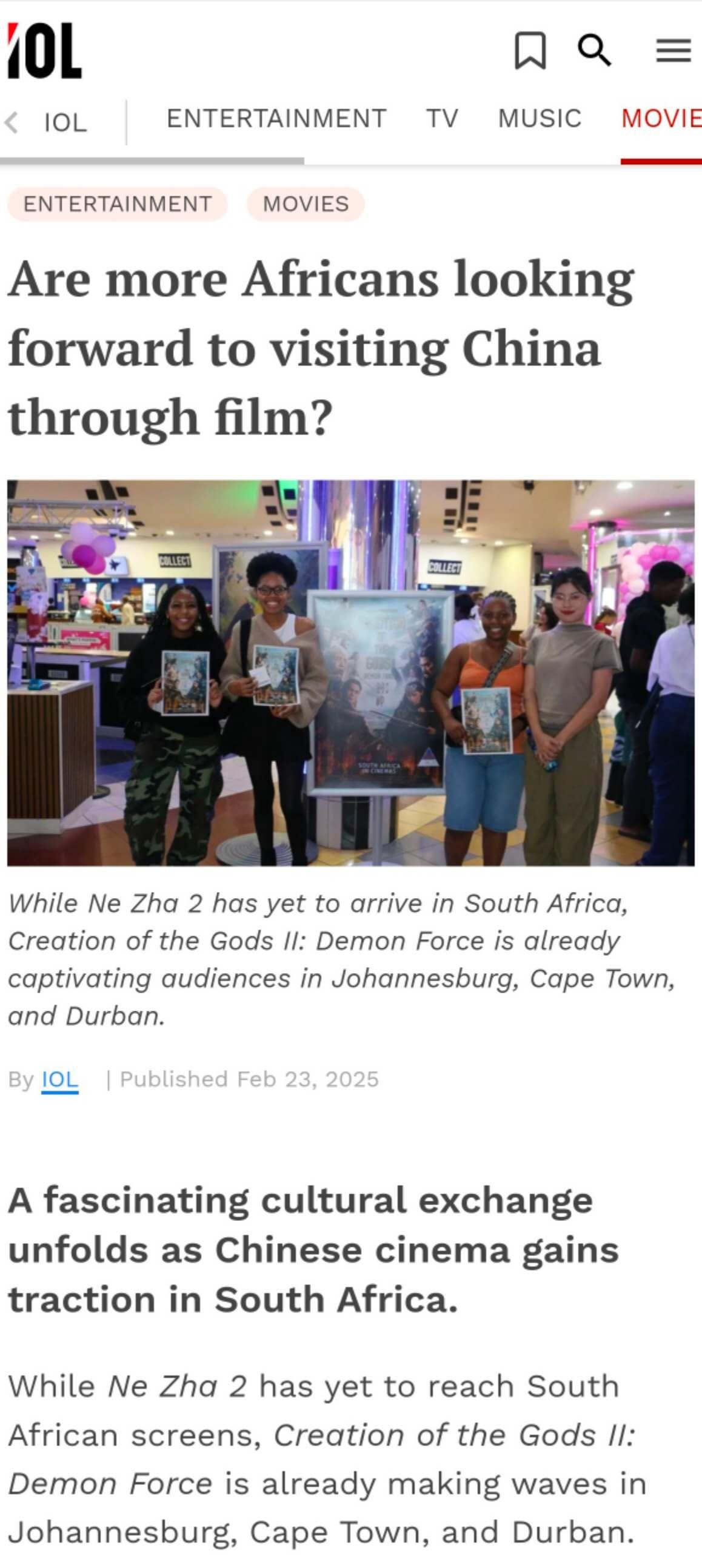 中國電影走進(jìn)非洲,走過“零的突破”,如今實(shí)現(xiàn)了高質(zhì)量推進(jìn)。近期隨著2025年蛇年春節(jié)檔中國影片在南非公映,越來越多的非洲伙伴走進(jìn)影院感受中國電影帶來的震撼。