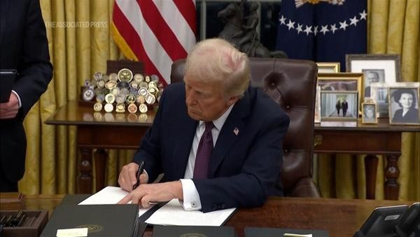 當(dāng)?shù)貢r(shí)間1月20日,特朗普簽署行政命令,要求暫停美國(guó)所有對(duì)外援助計(jì)劃。 美聯(lián)社視頻截圖
