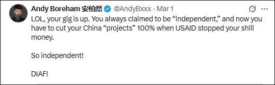 “笑死,你們?nèi)嗽O(shè)崩了。”在中國(guó)生活和工作多年的新西蘭媒體人安迪·博勒姆(中文名安柏然)也嘲諷道,“成天標(biāo)榜自己‘獨(dú)立’,現(xiàn)在美國(guó)國(guó)際開(kāi)發(fā)署斷了黑錢(qián),對(duì)華‘項(xiàng)目’得100%砍光。還真是獨(dú)立?。≮s緊涼透吧!”