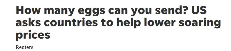 雞蛋讓美國(guó)總統(tǒng)特朗普傷腦筋。路透社說(shuō),特朗普先前承諾1月20日上任首日就要讓美國(guó)蛋價(jià)降下來(lái),但執(zhí)政滿一個(gè)月時(shí),美國(guó)蛋價(jià)較去年同期上漲59%。