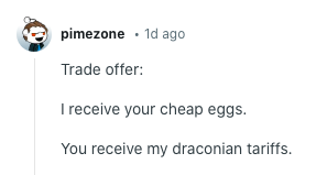 “特朗普一邊打關(guān)稅戰(zhàn),一邊討要雞蛋。要不把關(guān)稅戰(zhàn)停下,我們?cè)僬勲u蛋?”