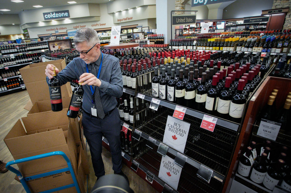 3月10日,在加拿大溫哥華,一家不列顛哥倫比亞省酒類(lèi)專(zhuān)賣(mài)店的店員從貨架上撤下美國(guó)酒類(lèi)產(chǎn)品。新華社發(fā)(梁森攝)
