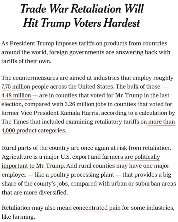 《紐約時(shí)報(bào)》對(duì)美國(guó)遭受反制關(guān)稅打擊的4000多個(gè)產(chǎn)品類別進(jìn)行的分析顯示,各行業(yè)共有約775萬人受到波及,其中約有448萬人來自大選中支持特朗普的地區(qū),主要集中在以農(nóng)業(yè)為主要產(chǎn)業(yè)的美國(guó)中西部、南部和東南部。